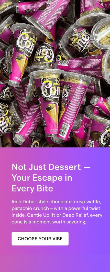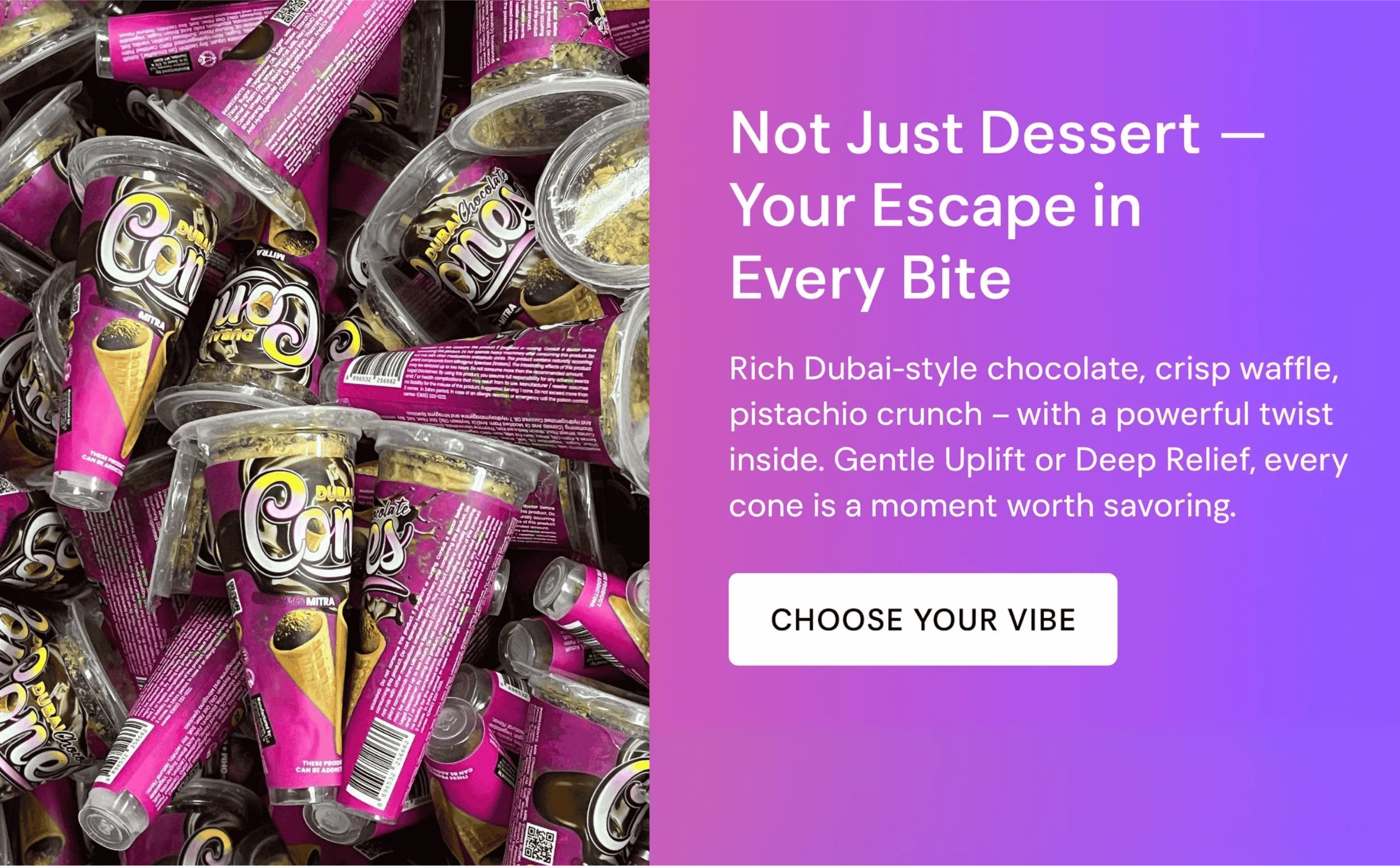 Dubai Chocolate Cones aren’t just a treat - they’re an experience. A golden waffle cone, filled with rich, velvety chocolate and crispy kataifi, hides a powerful secret inside. Each cone is infused with a premium blend designed to do more than delight your taste buds - it elevates your entire mood.